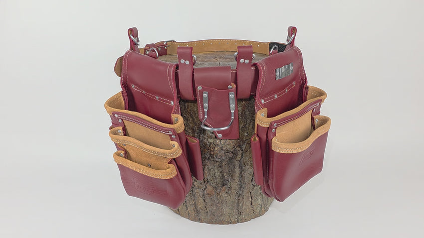 - This Maroon Leather Carpenter Tool Belt is 100% Genuine Grain Leather with Thickness of 2.70 mm. Tool Belt Leather is Carrying Total 17 Pockets. 2 large Capacity Tool Belt Pouches,1 Belt, 1 metal Hammer holder & additional smaller size pockets which means that you can carry a large number of tools in this Leather Tool Bag.
